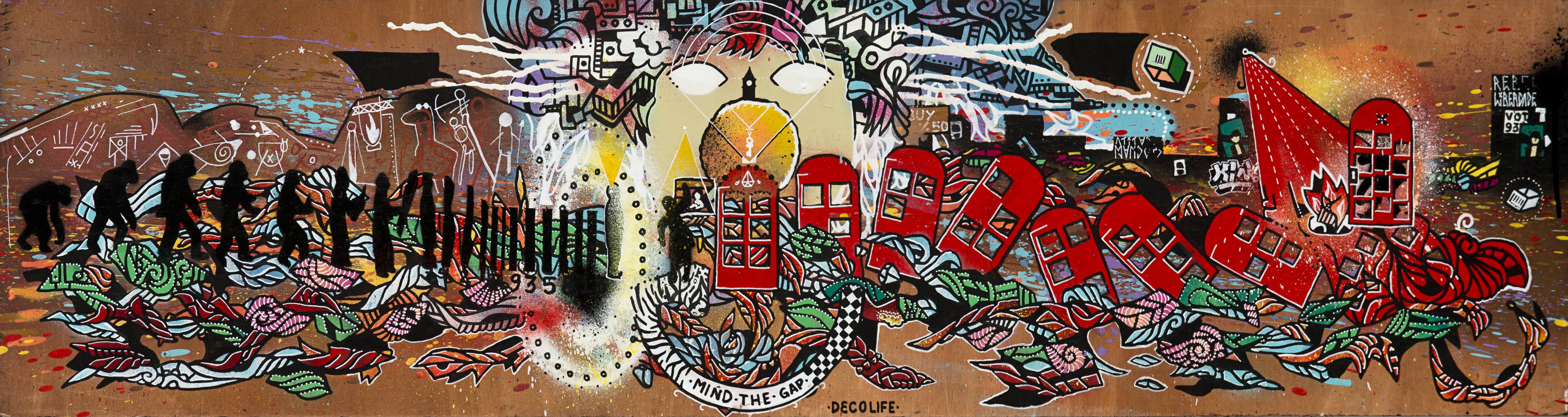 DECOLIFE, Mind the Gap III, Ahşap üzerine akrilik, sprey boya ve tükenmez kalem, 31 x 122 cm, 2013