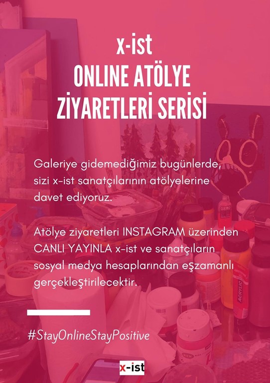COVID-19 virüsünün yayılmasını engellemek amacıyla 17 Mart Salı gününden itibaren ziyarete kapalı olan x-ist sanatseverleri sanatsız bırakmıyor. x-ist Online Atölye Ziyaretleri Serisi sanatçılarının atölyelerinin kapılarını izleyiciye açıyor. “Çevrimiçi kal, olumlu kal” sloganıyla başlatılan seri sanatçıların atölye pratikleri üzerine kolektif bir sohbet ortamı öneriyor ve sanatçıların üretimleri üzerine daha derin bilgi edinebilme imkânı sağlıyor. Atölye yayınları Instagram üzerinden canlı yayınla x-ist ve sanatçıların sosyal medya hesaplarından eşzamanlı olarak gerçekleşecektir.